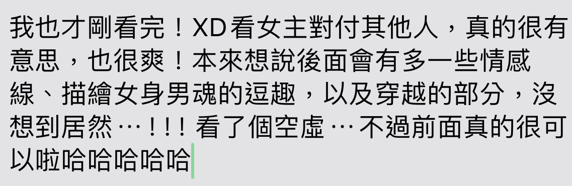 → pw519: 女主前半部還會出現男人的OS, 後面10集幾乎完全變女人了~XD08/30 22:50