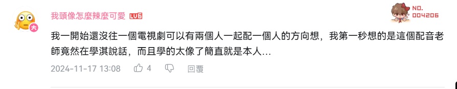 → firstname: 我一開始也是想說,這個配音員好厲害,居然能模仿本人 11/27 16:22