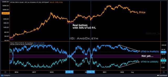 綜合以上幾點數據結論,CryptoQuant 分析師 CoinLupin 將 UTXO 數據以獲利和損失的比