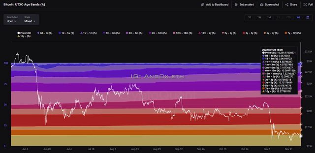 UTXO Age Bands (%) 總結了長期和短期持有者的行為以及價格走勢,我們可以很簡單的分