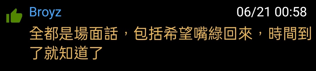 推 Broyz: 全都是場面話,包括希望嘴綠回來,時間到了就知道了 06/21 00:58