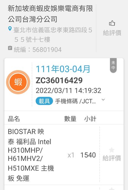 2022/03/11映泰官方蝦皮購入,