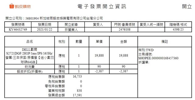 ◎硬體型號:DELL S2721DGF 27吋2K165hz螢幕