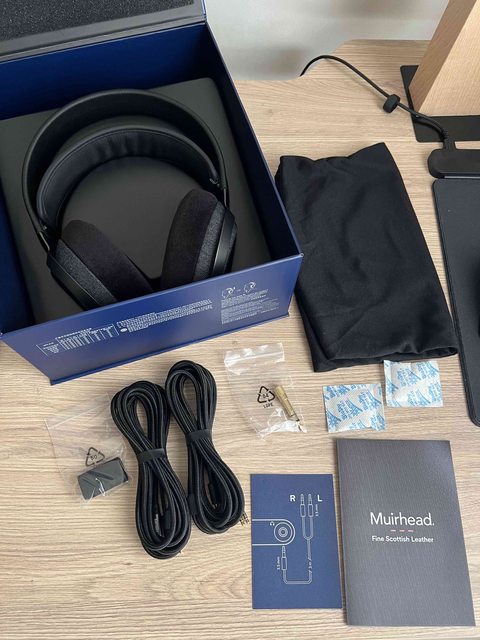 耳機本體、質感很好的棉布、圖例說明書及Muirhead皮革保養說明