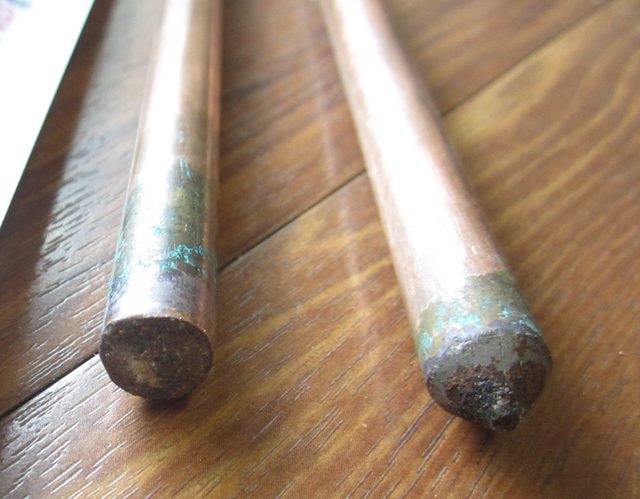 上次沒用完的接地銅棒,擺在倉庫已經出現銅綠,接地棒整個變色了