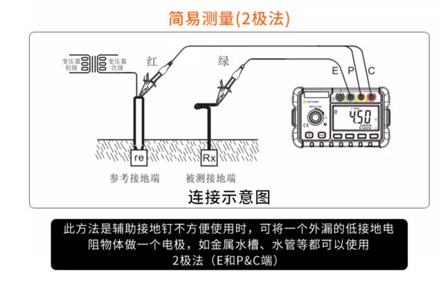 二極法 測量,1支接地棒(E端) + 另一端點是變壓器的接地端 (有配件線可同時插到 P端