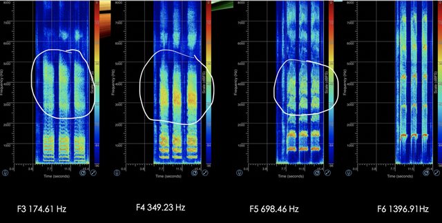 例如高音F(F5,689hz)的第四諧波,高音C(C5,523hz)的第六諧波