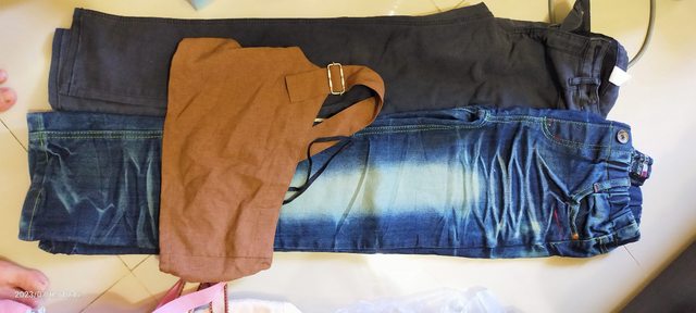 三件十歲以上大童衣褲。牛仔褲褲頭有點鬆。自己換鬆緊帶