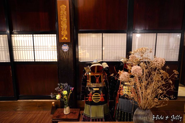 進入大門後的玄關,可以看到使用蘆名氏家紋「丸に三つ引き」的鎧甲,只是不知道牆上