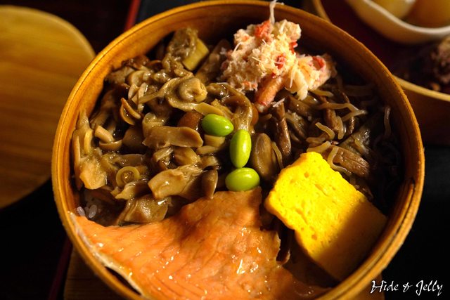 到木片的香氣,白米飯也被鮭魚汁、滑菇高湯滲透,輪箱飯也可以說是輪"香"飯啊,根本