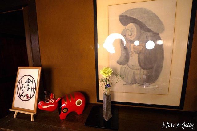 廣間裡的矮櫃上有可愛的畫作與赤べこ,一旁還寫著「会津おでん」(会津關東煮),查了