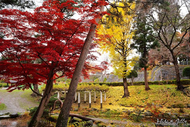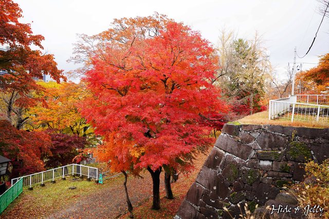 走到本丸東側的淡路丸,這裡也有漸層的楓紅,左側後方的石垣,就是盛岡城的天守台。