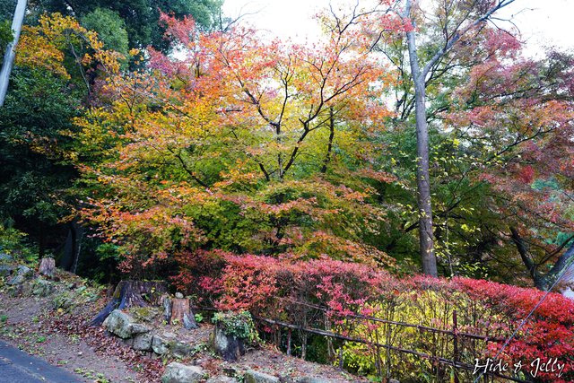 的方向,途中可以看到本丸北側下方的石垣,前方還有可愛的小楓葉陪襯。
