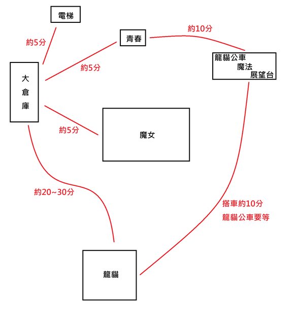 : : 對於青春之丘、魔法之里、魔女之谷、大倉庫、DONDOKO森林這五大區域的參觀順序,請