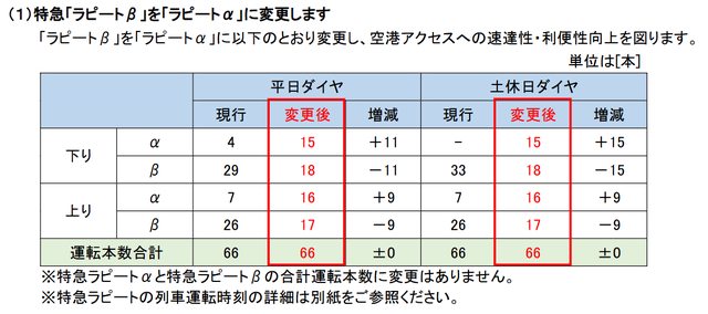因此對往返機場的列車做調整:Rap:itβ部分改為α、空港特急增班增節