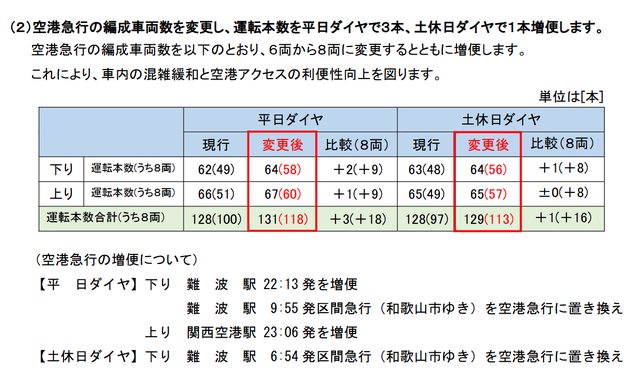 空港急行部分,平日雙向共增加3班,假日單向增加1班