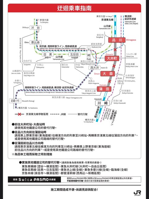 要穿越停開範圍,可以在上野、東京、品川、川崎、橫濱