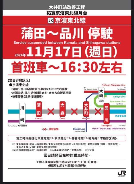 為此,京濱東北線蒲田~品川在日本時間約16:30為止停開