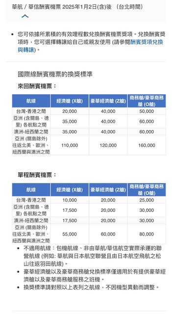 在明年1/2後將調漲至跟其他亞洲航線一樣經濟艙35000哩 商務艙60000哩