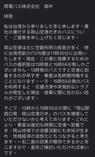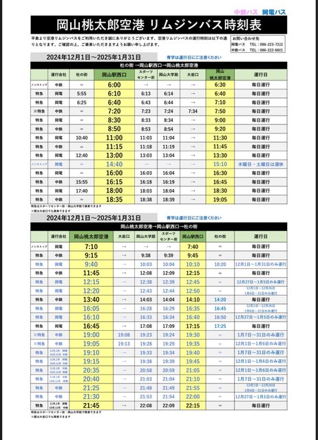 岡山站西口—>岡山機場方向如岡電公司回覆,增加14:40出發的直達班次,大約會在15:1