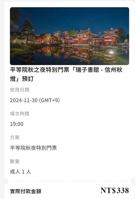 1. 讓售品項: 11/30平等院夜間賞楓門票 1900場次