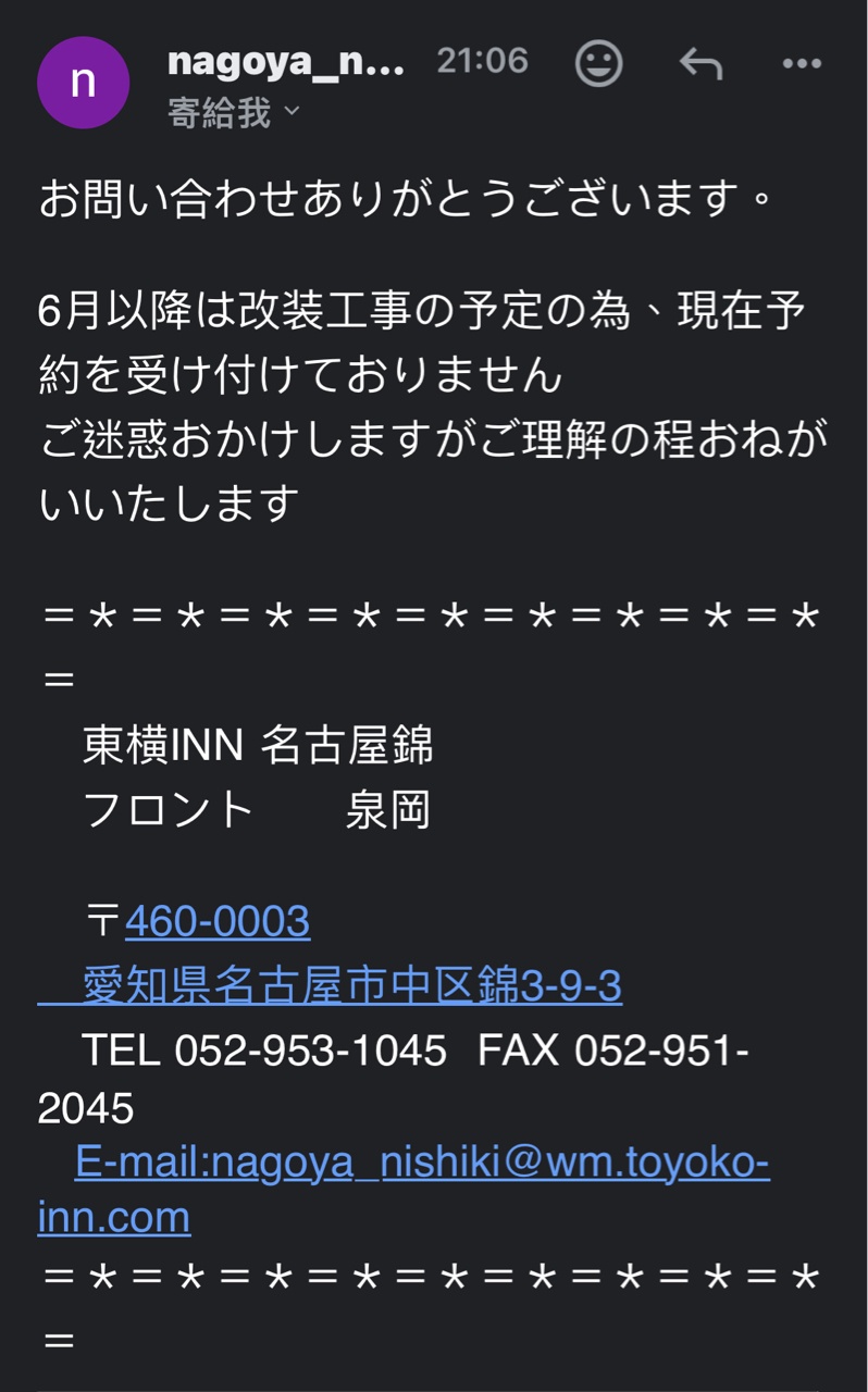 → sarahfrog : 先恭喜你避雷,名古屋錦是我住過最可怕的東橫,深夜 03/10 00:36