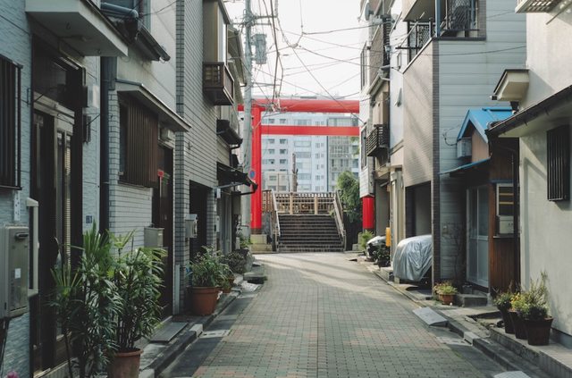 實際見到鳥居的當下,覺得比想像中寬大,兩側幾乎都是獨棟的一戶建。站在這裡瞬間回