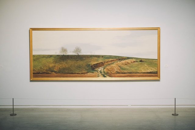 的油彩作品《麓郷早春》,作品前方確實有張藍色椅子,但並非置中,拍攝時應該有稍微