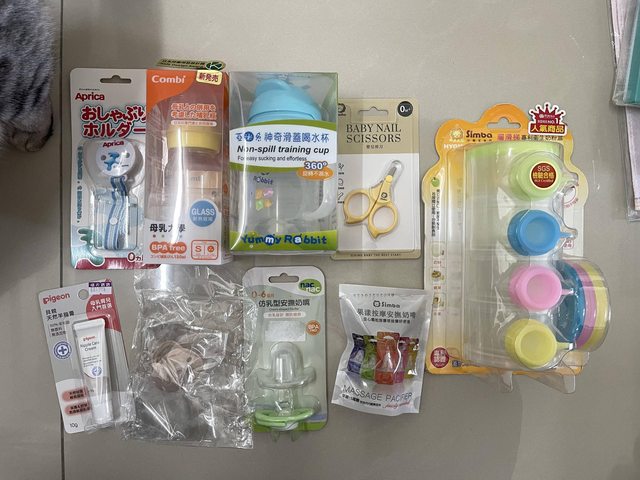 1.奶粉盒、小獅王嬰兒剪刀、喝水杯、奶瓶、奶嘴鏈、奶嘴、羊脂膏