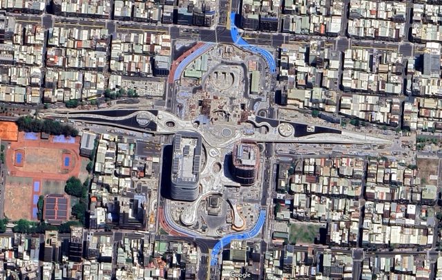 高雄車站部分可以看到頂棚開始從中央往北增建,以及完工的站東路