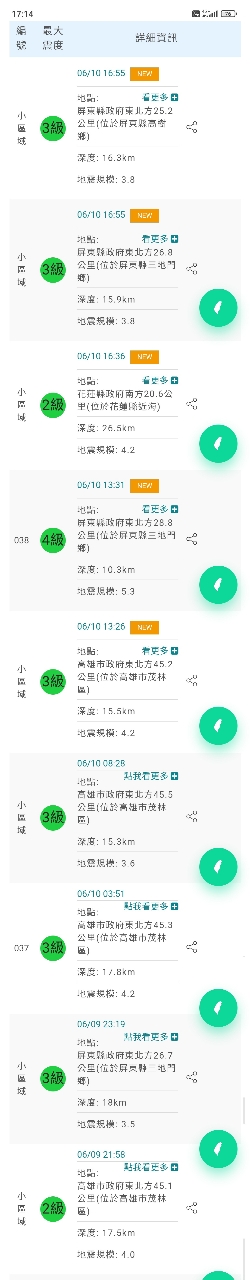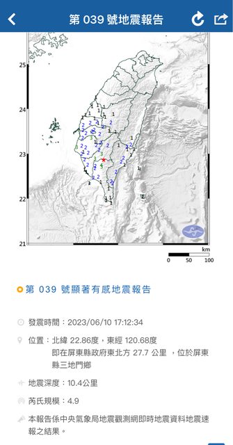 推 caf00765 : 震央又是三地門.. 那邊有斷層門嗎?感覺這幾天應該06/10 17:15