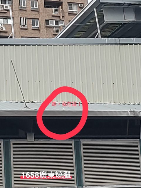 他就拍拍翅膀飛到龍華市場面向忠言路1658燒臘招牌上方的鐵皮了!