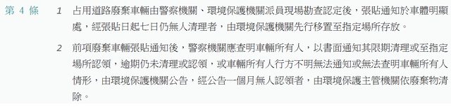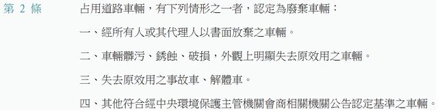 占用道路廢棄車輛認定基準及查報處理辦法 這個辦法就是依我上面講的