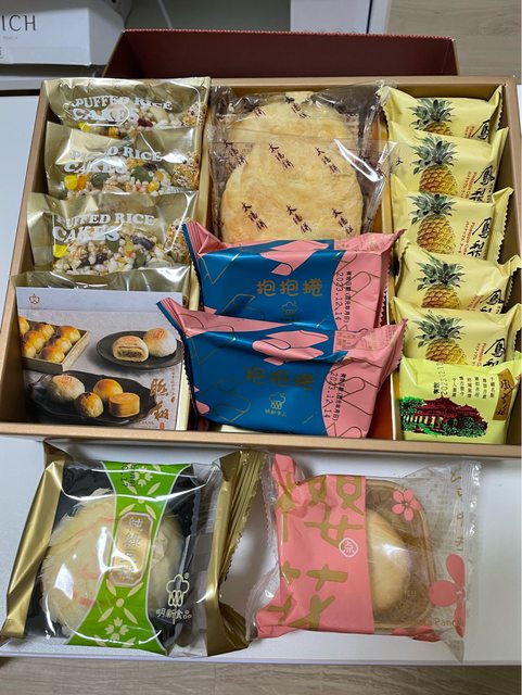 內容物有:鳳梨酥、太陽餅、抱抱捲、八寶米香