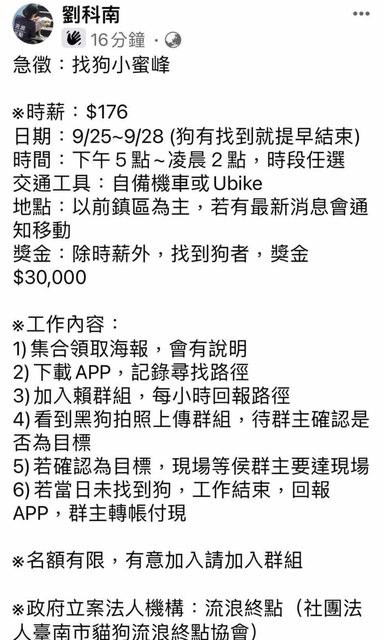 推 button5 : 還沒找到噢,希望黑黑快回家 10/02 15:44