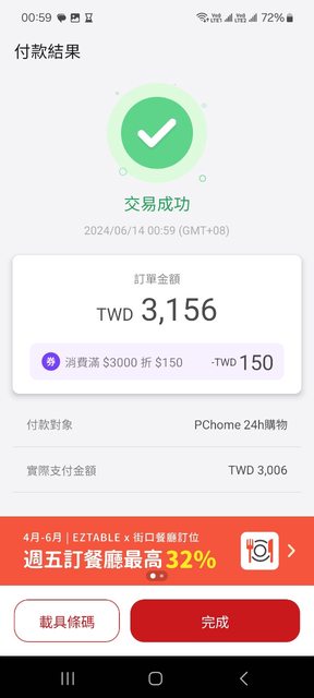 → waakye: 3000折150前幾天PCHOME日的啦。當時5%沒114.24.137.211 06/18 00:16