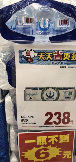 NU PURE泉水(250ml*40瓶) 全聯238元