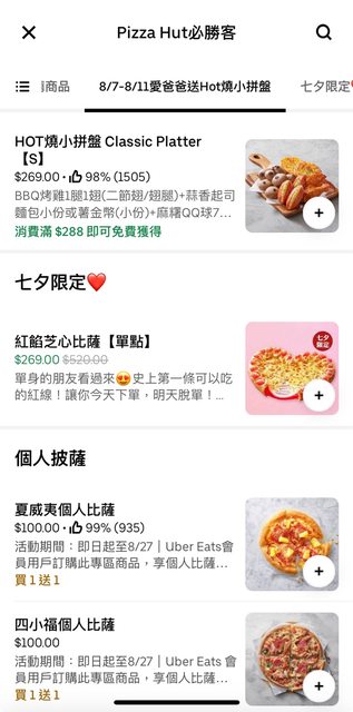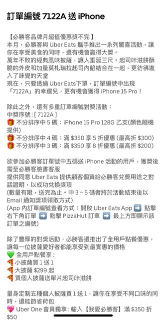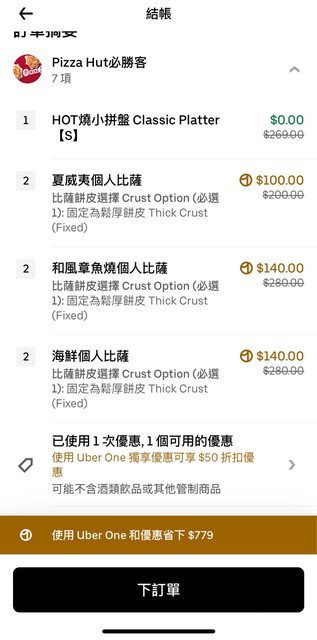 推 TZUYIC: Uber Eats折價券變難用了,必勝客這些加一101.137.120.167 08/10 15:20