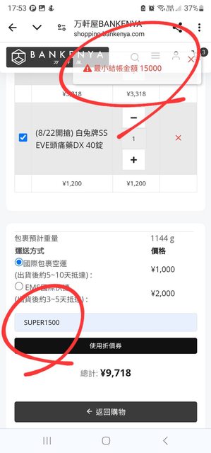 標題[情報] 万軒屋折扣碼 ¥15000折¥1500