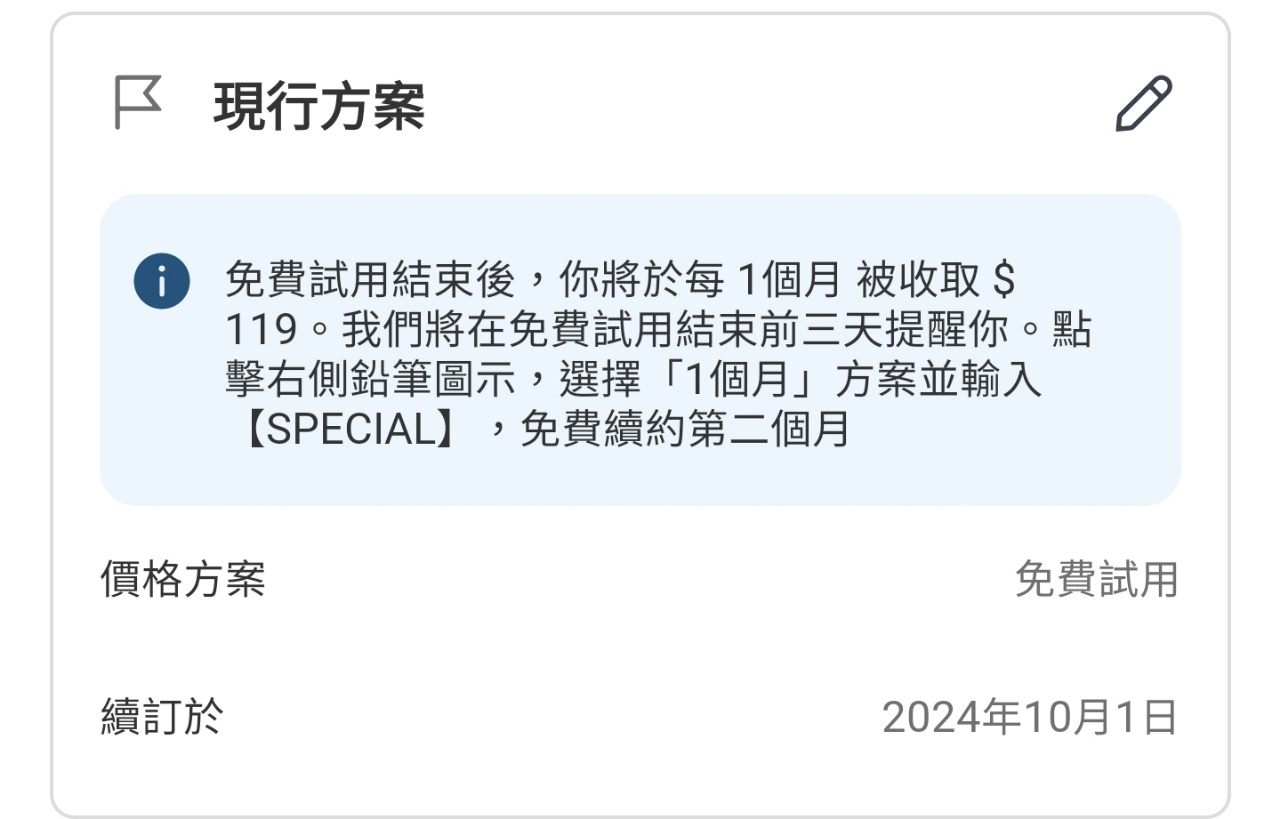推 angelikatsai: 1.先按免費試用一個月 2.再點編輯 203.190.16.211 09/01 13:17