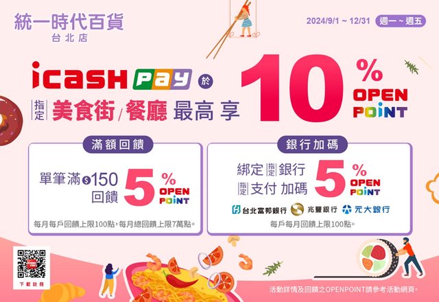 活動期間每週一至週五以icash Pay綁定指定銀行指定支付方式於台北時代百貨美食街與