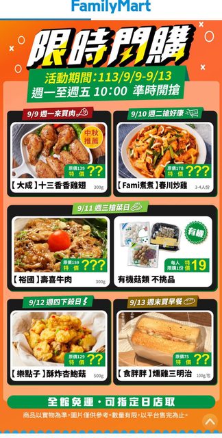 標題[情報] 全家食食購 9/9-9/13 每日10點閃購