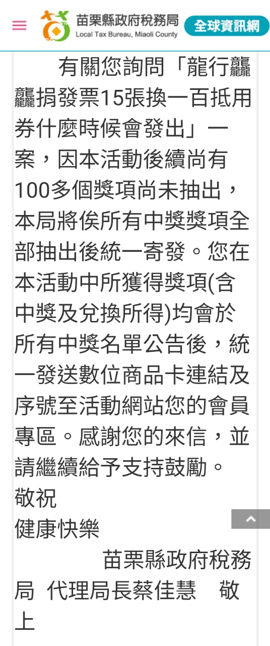 推 b08902021: 非苗栗消費發票也能參加活動捐贈,我180.217.49.174 09/11 10:46