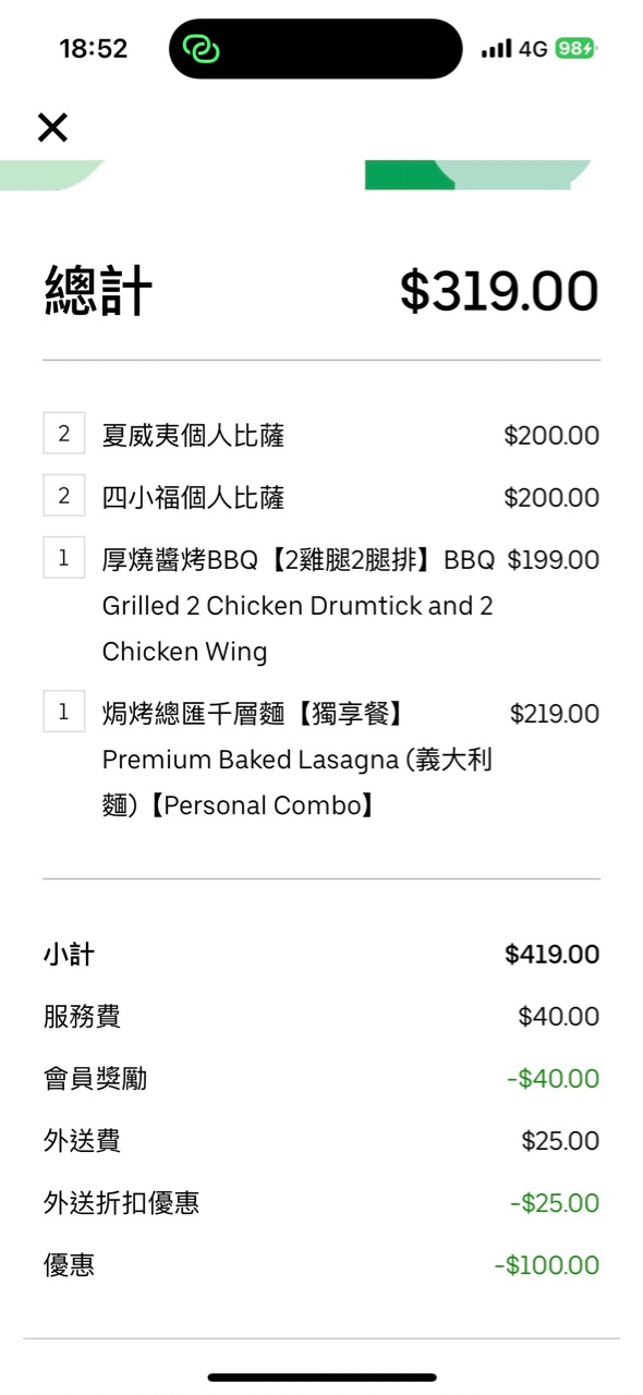推 sulamau: 感謝樓主分享,同樣點了4比薩+2份雞299元 101.10.60.180 09/11 17:36