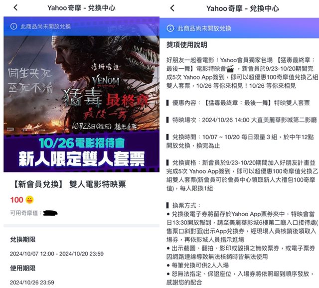 標題[情報] 奇摩App新會員免費換猛毒3雙人票 (每日3組)