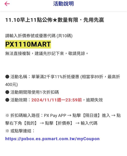 : 折扣碼[PXMART1108]分享給大家~
