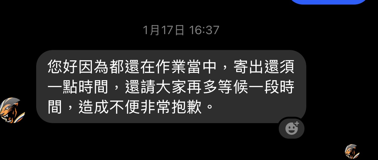 → lionsDuDu: 候到,客服說是一月中到一月底會收到 01/20 08:22