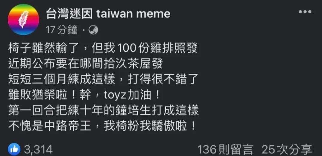 → william12tw : 賽前喊打死鍾培生 賽後喊3個月打四年很棒了07/06 01:36