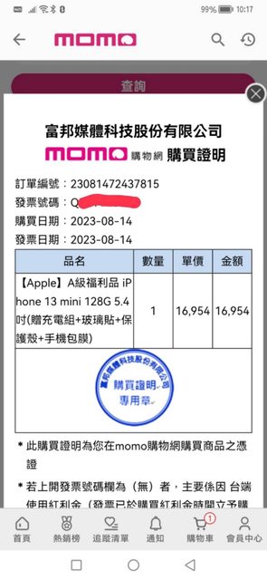 iphone 13 mini 128g 紅色,背面已貼膜前幾天8/14在momo購買,花了16954元,覺得太
