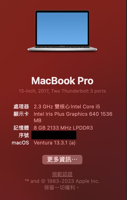 處理器:2.3GHz 雙核心 Intel Core i5